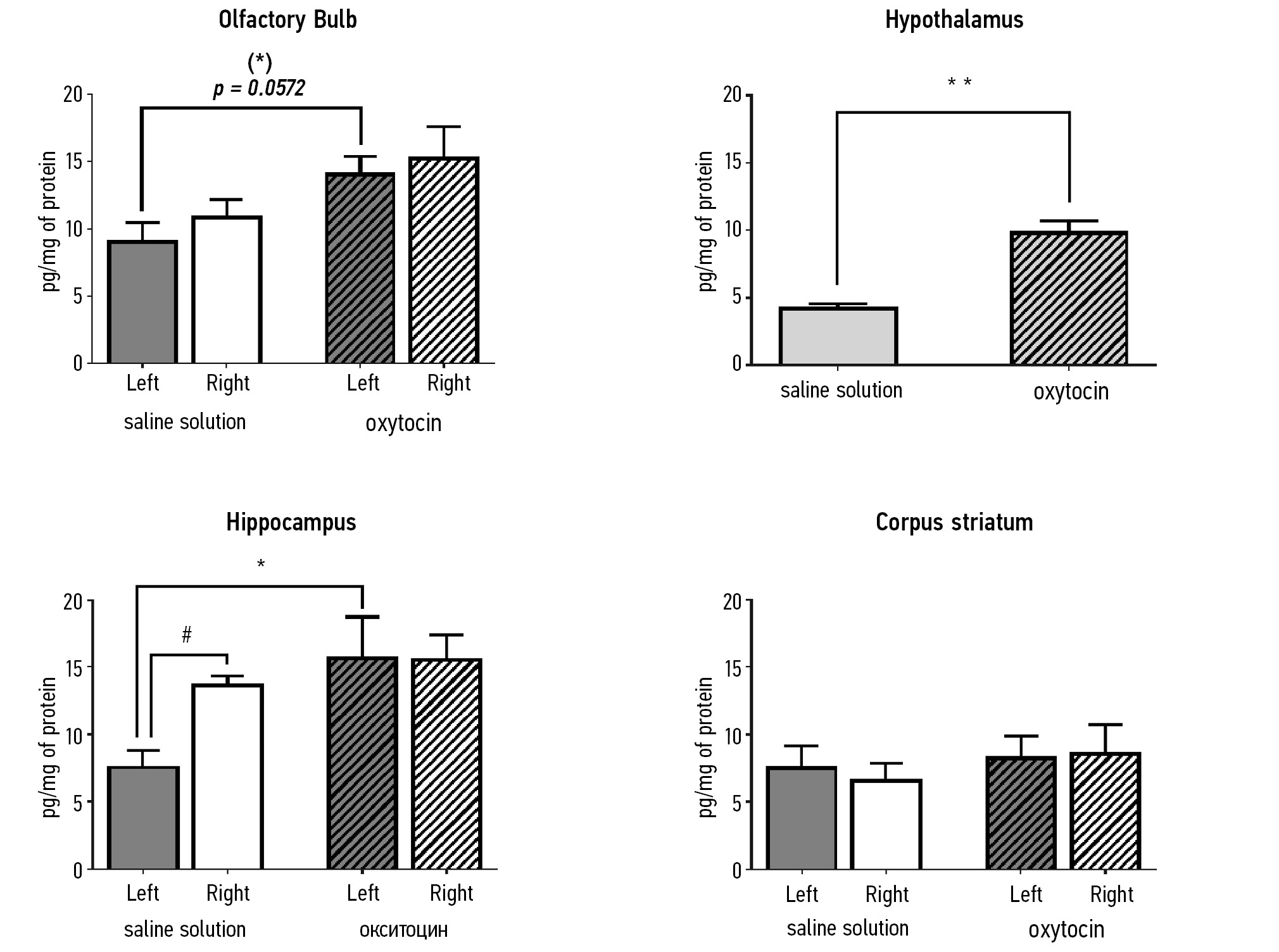 MATERIALS AND METHODS: Experiments were conducted on 12 male outbred white mice. The experimental group received intranasal oxytocin (5 IU/1 mL, 10 μL per nostril), while the control group received an equivalent volume of saline. Oxytocin levels were measured 15 minutes post-instillation in the hypothalamus, olfactory bulbs, striatum, and hippocampus on both sides of the brain using an enzyme-linked immunosorbent assay (ELISA).