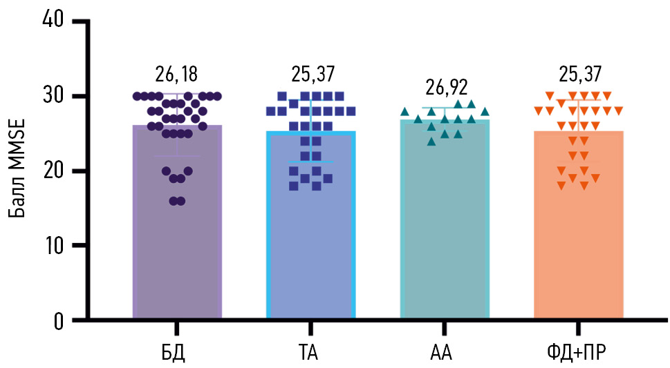 Fig. 3. Mini-Mental State Examination (MMSE) scores after resolution of psychosis according to therapeutic strategy: БД, infusion therapy and benzodiazepines; TA, addition of typical antipsychotics to benzodiazepines; AA, addition of atypical antipsychotics to benzodiazepines; ФД+ПР, forced diuresis combined with propofol.
