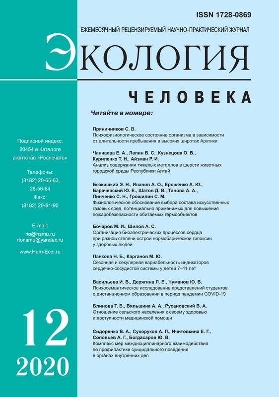 Цель работы - оценка психофизиологического состояния организма человека с учетом длительности пребывания в поселке Баренцбург, архипелаг Шпицберген. Методы. Обследованы 112 человек в возрасте 35-43 лет: 60 проживали в поселке не более 6 месяцев (группа 1), 52 - более полугода (группа 2). Психоэмоциональное состояние изучалось с помощью методики ситуативной и личностной тревожности (ЛТ) Ч. Д. Спилбергера и теста дифференцированной самооценки функционального состояния. Вариабельность сердечного ритма (ВСР) оценивалась с применением комплекса «Омега-М». Показатели ВСР ранжированы по типам регуляции сердечного ритма. Данные представлены в виде средней арифметической и стандартной ошибки среднеквадратичного отклонения. Для выявления значимости межгрупповых различий был применён U-критерий Манна - Уитни. Значимость различий считалась достоверной при уровне р ≤ 0,05. Результаты. Данные спектрального анализа в диапазоне HF, ms2, LF, ms2, TP, ms2 и в нормализованных единицах ниже нормативных величин. В группе 1 показатели самочувствия (U = 200,5, p = 0,032) и настроения (U = 207,0, p = 0,043) в пределах нормативных значений, но недостаточные для комфортного состояния. В группе 2 - уровень ЛТ выше (U = 245,0, p = 0,002), проявляется в постоянной готовности к неблагоприятному развитию событий. В группе с умеренным преобладанием центральной регуляции уровень LF, ms2 спектра мощности выше в группе 1 (U = 9,0, p = 0,006). В группе 2 с выраженным преобладанием центрального контура регуляции, при высоких показателях SI, у. е. (U = 49,0, p = 0,027), уровень RMSSD (U = 27,0, p = 0,001) и SDNN (U = 48,0, p = 0,023) ниже. В группе с умеренным преобладанием автономной регуляции - выше SI, у. е. (U = 226,0, p = 0,029) в группе 1 и высокие показатели ТР, ms2 (U = 218,0, p = 0,020), VLF, ms2 (U = 216,0, p = 0,018) в группе 2. Выводы. На фоне общего снижения как временных, так и частотных показателей ВСР у исследуемых наблюдается усиление парасимпатических влияний с более низкими показателями дифференцированной оценки состояния у проживающих не более 6 месяцев и преобладание симпатического тонуса с высоким уровнем личностной тревожности у проживающих более полугода, выражающееся в гиперадаптивном состоянии мобилизации энергетических и метаболических резервов.