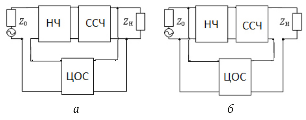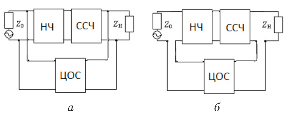 Рис. 1. Структурные схемы усилительных звеньев с параллельной по напряжению (а), последовательной по току (б) общими цепями обратной связи и ССЧ