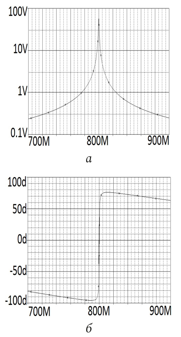 Рис. 10. АЧХ (а) и ФЧХ (б) эквивалентной схемы (рис. 9), полученные в системе OrCad