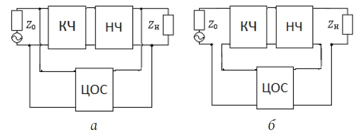 Для отыскания передаточных функций исследуемых усилительных звеньев будем использовать известные правила применения матриц различных параметров для описания четырехполюсников и их соединений, а также условия нормировки общей матрицы передачи узла «КЧ–НЧ–ЦОС» [1; 2]. На основании этого запишем передаточную функцию для структуры с параллельной по напряжению ЦОС, показанной на рис. 1, а, в следующем виде: