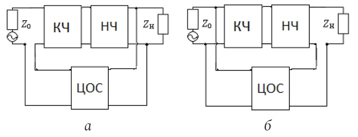 Рис. 1. Структурные схемы усилительных звеньев с параллельной по напряжению (а), последовательной по току (б) общими цепями обратной связи и КЧ