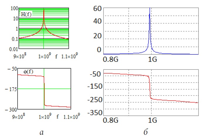 Рис. 10. АЧХ- и ФЧХ-усилители (рис. 9), полученные в системе MicroCap (а) и в системе MathCad (б)
