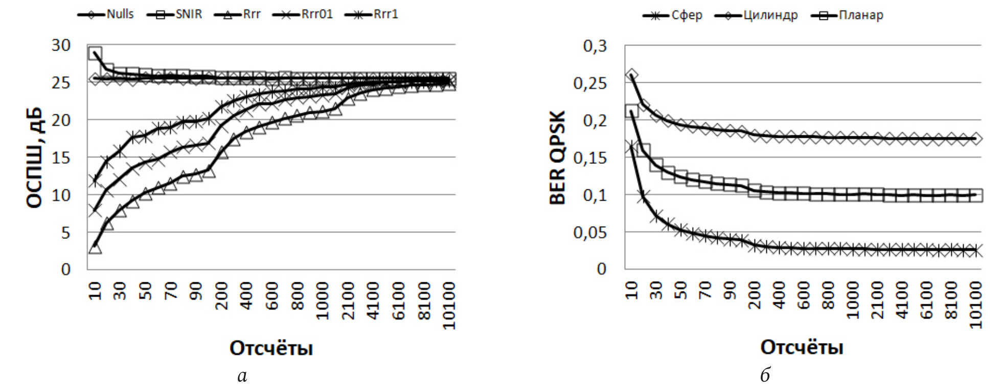 На графиках из рис. 2, б показаны вероятности битовой ошибки рассматриваемых антенных решеток и алгоритмов диаграммообразования в зависимости от направленности элементов. Из рис. 2 видно, что кривые а и б взаимно обратные. Так, к примеру, битовая ошибка полусферных решеток снижается от 10-3 до 10-9 с увеличением КНД антенн. При этом использование АР цилиндрической и планарной геометрий вызывает волнообразный характер изменения появления ошибок QPSK-сигнала, т. е. колебание в пределах 10-3 до 10-5 для ЦиАР и 10-3 до 10-8 для плоской АР.