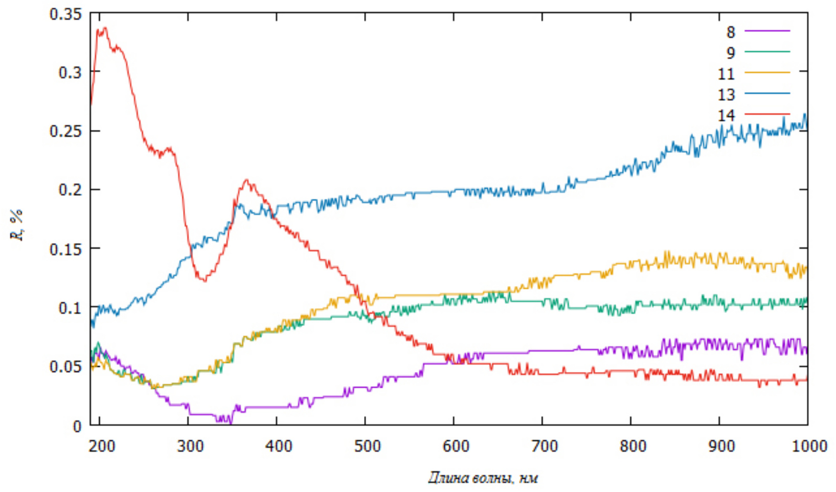 На рис. 8 показаны спектры коэффициента отражения образцов 8, 9, 11 и 14 в сравнении с 13.