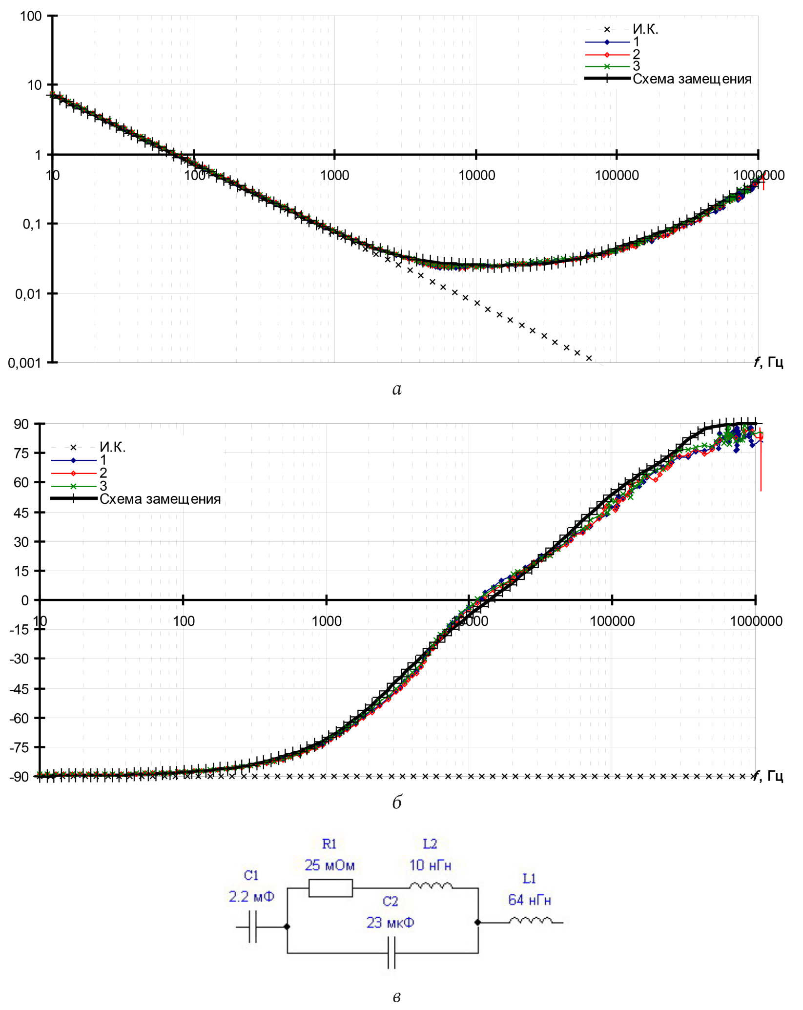 Рис. 1. Конденсатор К50-17 820 мкФ × 400 В (алюминиевый оксидно-электролитический): а – модуль полного сопротивления; б – фаза полного сопротивления; в – схема замещения