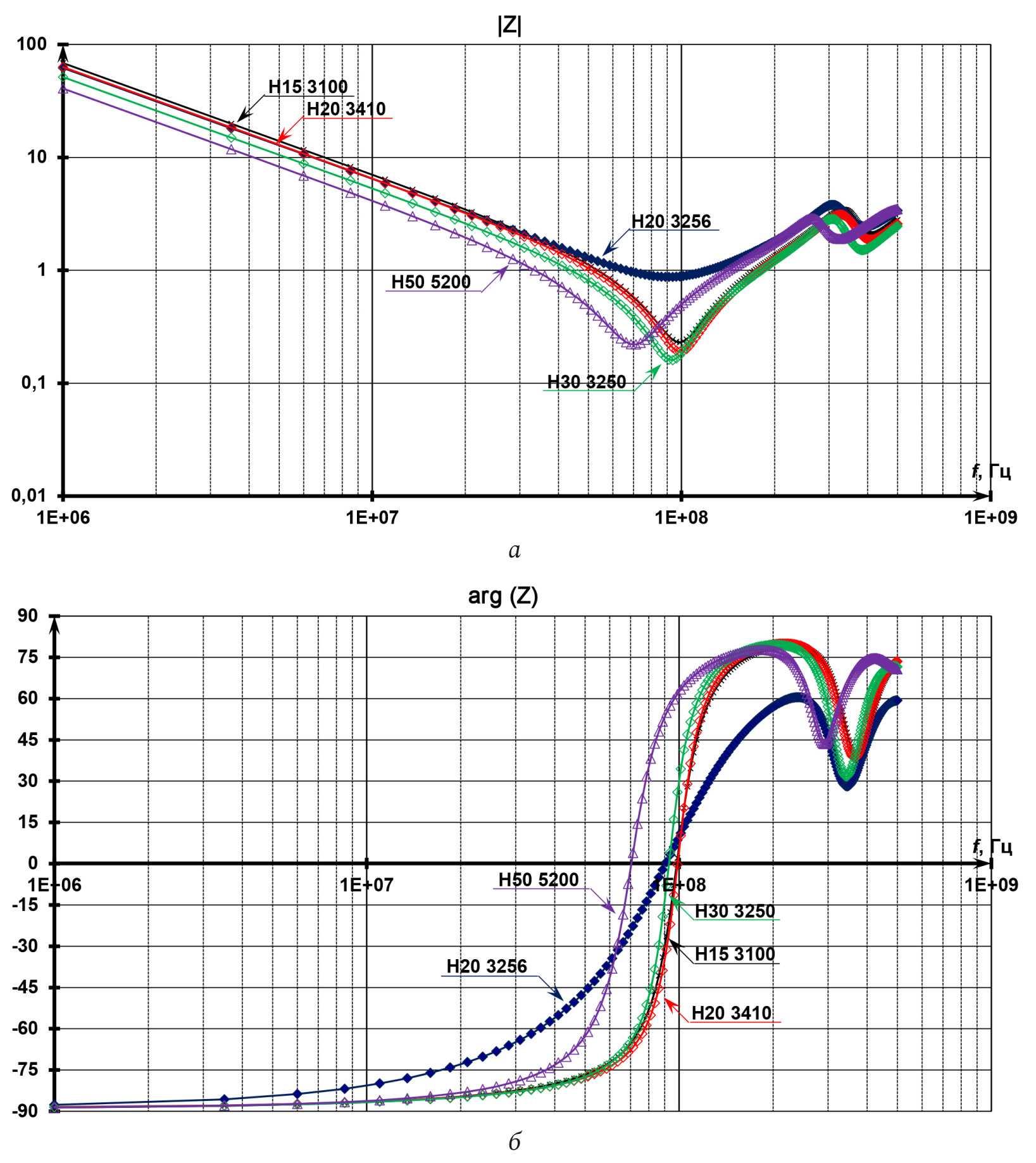 Fig. 3. Measured magnitude (a) and phase (b) of dielectric impedance of different performance groups (Н15 – Н50) with different permittivity ε