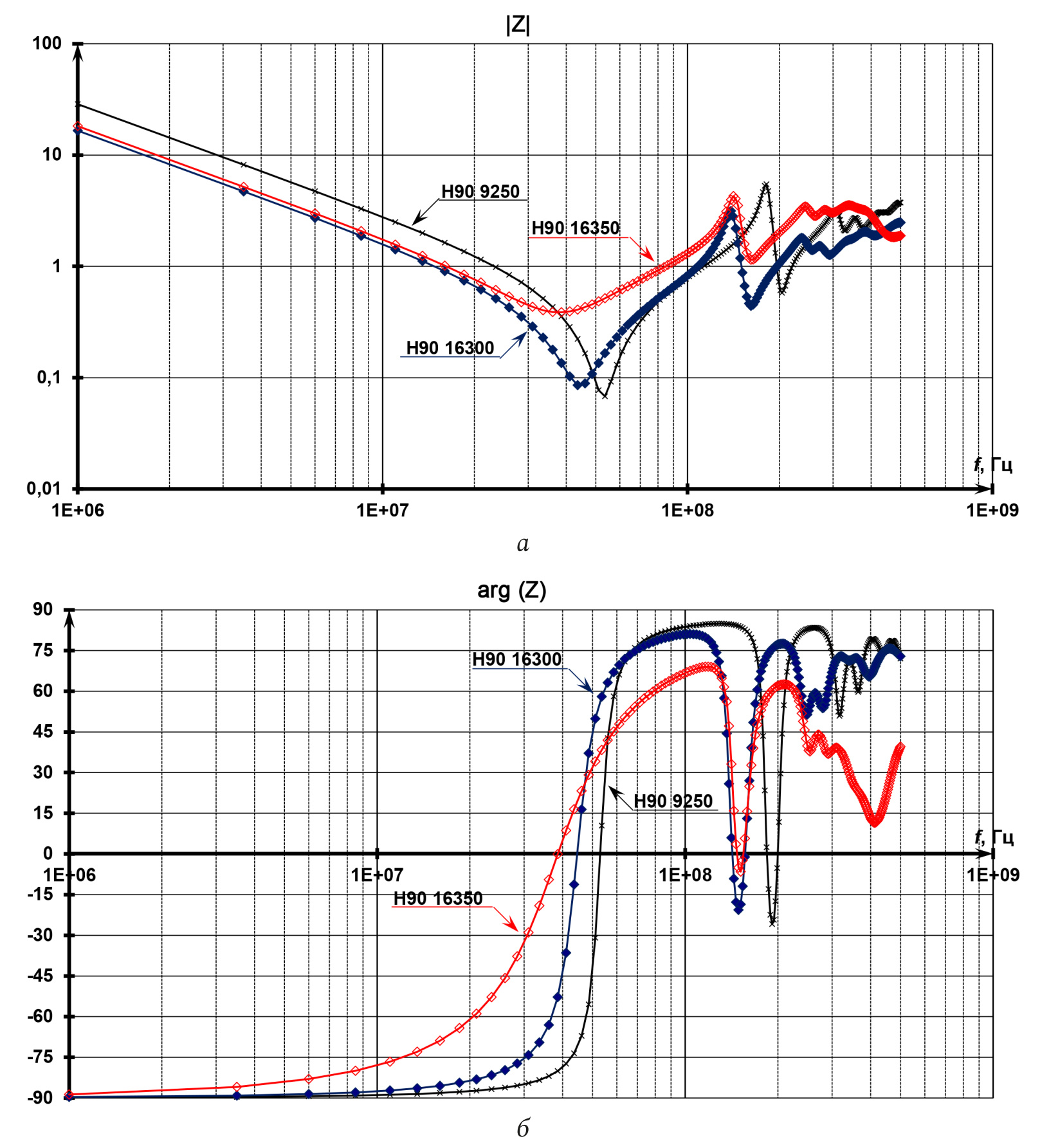 Fig. 4. Measured magnitude (a) and phase (b) of dielectric impedance of performance group Н90 with different permittivity ε