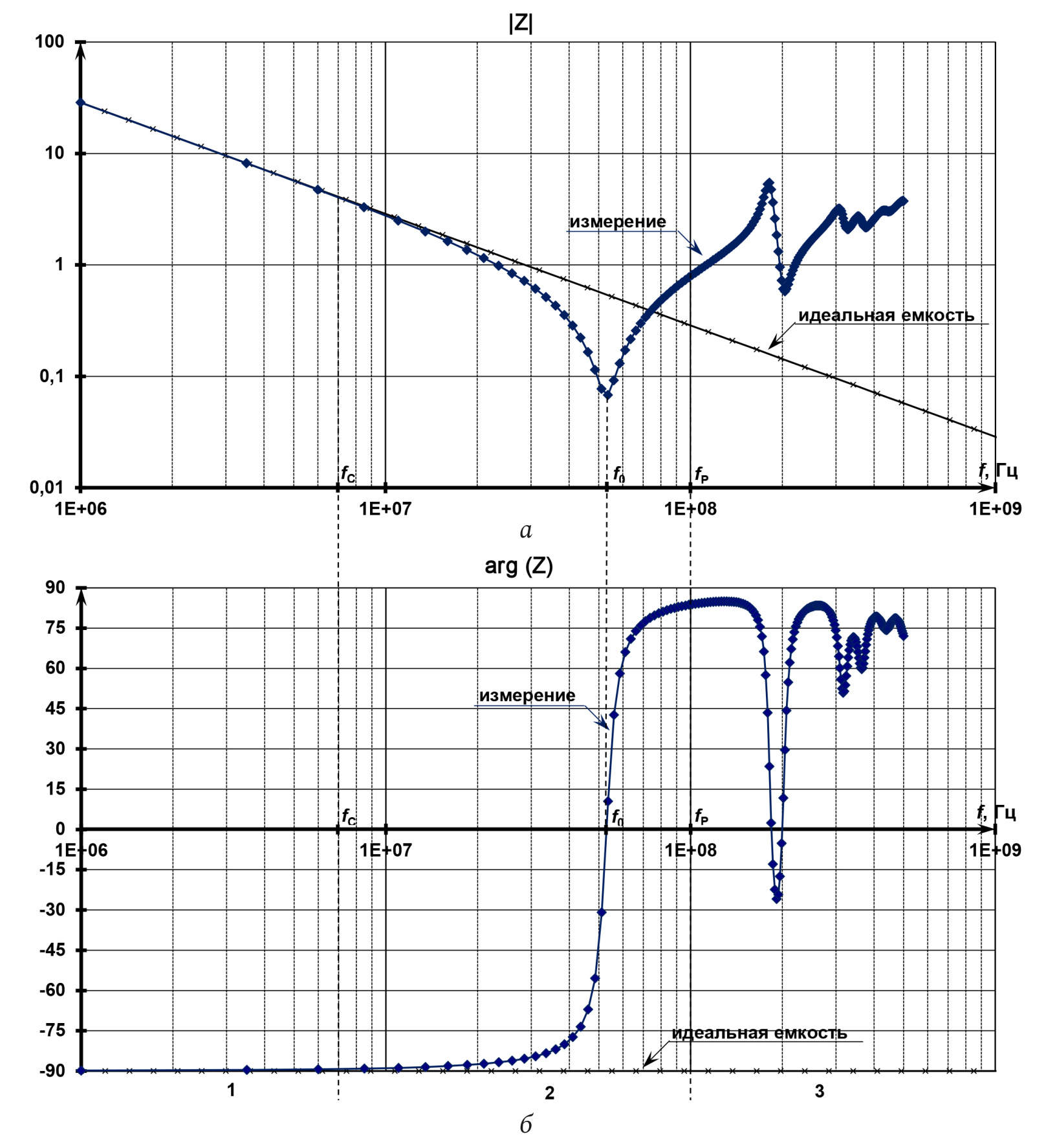 Рис. 7. Модуль (а) и фазы (б) комплексного сопротивления диэлектрика: измеренное значение в сравнении с рассчитанным по схеме замещения (рис. 6)