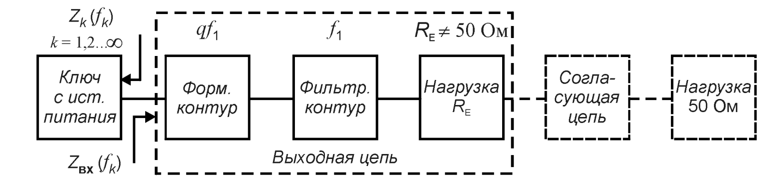 Рассмотрим на рис. 1 типовую модель устройства Е-класса. Транзисторный элемент с источником питания представим в виде ключа с внутренним активным сопротивлением rк, величина которого меняется скачком от нуля до бесконечности. Характерной для реальных СВЧ-транзисторов емкостью ключа в данной модели пренебрежем. Выходная цепь является реактивной и обычно содержит соединенные последовательно формирующий qf1 и фильтрующий f1 контуры. С ее помощью на выходе ключевого активного элемента формируются необходимые для работы класса Е импедансы нагрузок Zk(fk) на основной частоте f1 и ее гармониках fk. Формирующий контур, который в q-раз расстроен относительно частоты возбуждения, в этом процессе играет главную роль. Благодаря этому контуру в моменты включения (выключения) транзисторного ключа реализуются условия равенства нулю либо тока, протекающего через ключ, и его производной, либо напряжения на ключе и его производной. Другими словами, реализуется режим «переключения при нулевом напряжении или при нулевом токе» [1]. В результате устраняются коммутационные потери в моменты либо включения транзистора, либо его выключения соответственно. Нагрузкой выходной цепи является специально рассчитанное для работы в классе Е сопротивление RE, которое принципиально отличается от сопротивлений стандартных трактов. Типовое устройство Е-класса может также содержать (а может и не содержать) цепь согласования этого сопротивления RE со стандартной 50-Омной нагрузкой.