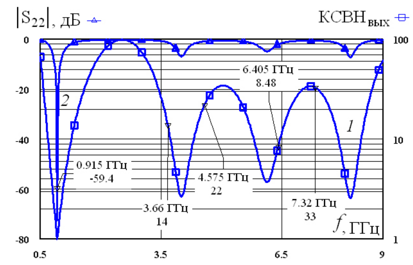 Рис. 2. Зависимости КСВНвых (кривая 1) и модуля коэффициента отражения на выходе |S22| (кривая 2) от частоты