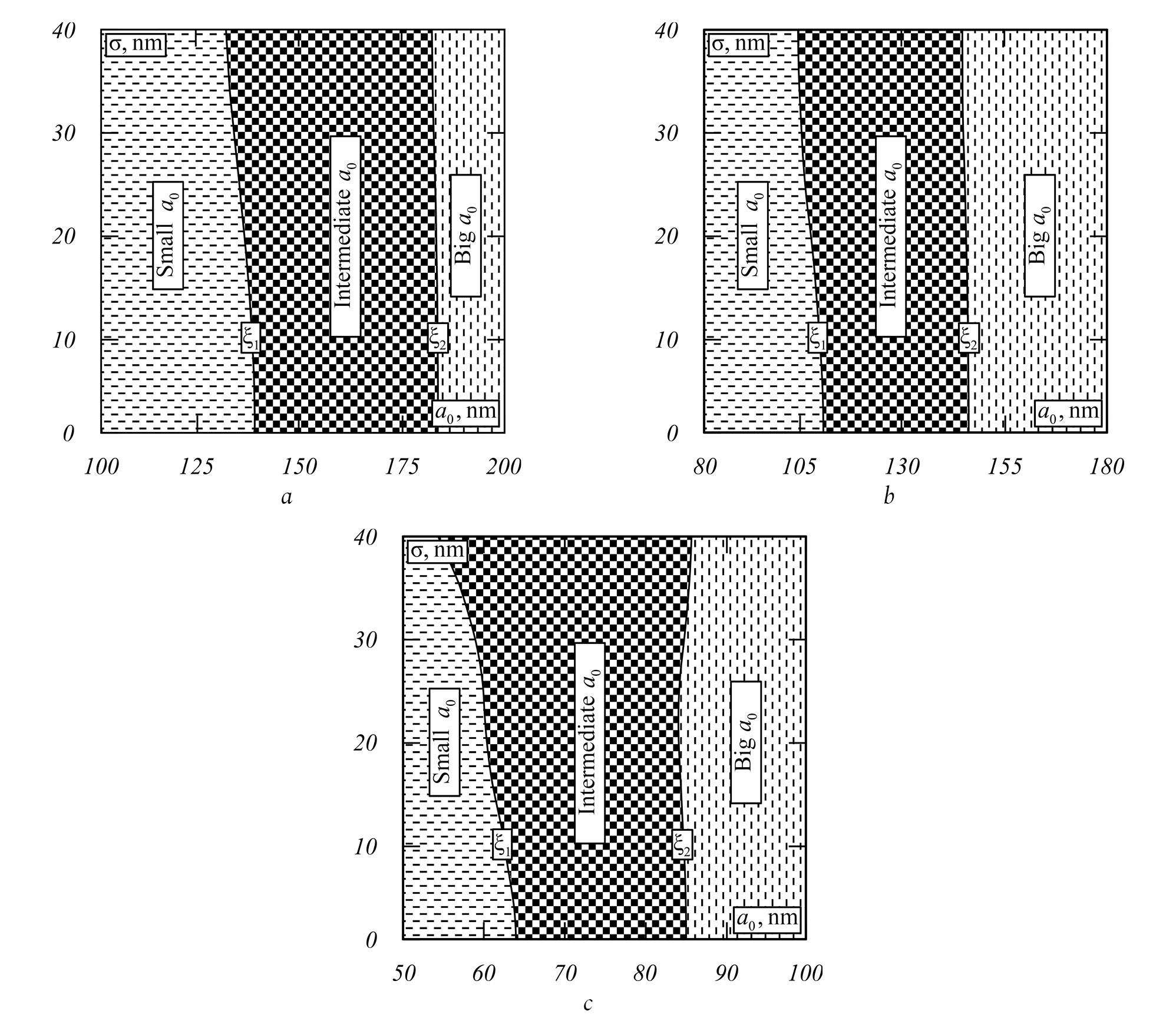 Fig. 4 shows the dependence of the width of the cutout ring on the mean–square deviation of nanoparticles corresponding to the intermediate average radii. In terms of the dependence of on a minimum value, which shifts to the region of smaller mean–square deviation values with the increase in the average radius of nanoparticles, is recorded. Notably, for any fixed value of nm, the value of monotonically decreases with the increase in a0, which is also observed in the case of a heterogeneous monodisperse medium [17].