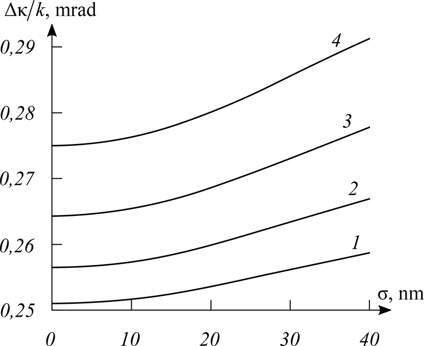 Fig. 4. Graph of the dependence of the cut “ring” width on the standard deviation at mm, (1), 148 (2), 156 (3), 190 nm (4)