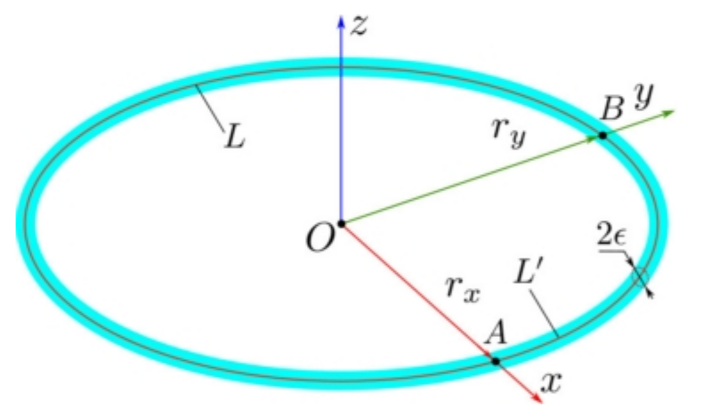 Рассмотрим решение внутренней задачи электродинамики на эллиптической рамочной структуре (ЭР) методом собственных функций. Геометрия структуры показана на рис. 1. Проводник ЭР, обладающий бесконечно большой проводимостью, имеет круглое сечение диаметра которое много меньше длины волны и полной длины образующей проводника. Таким образом, для ЭР целесообразно использовать тонкопроволочное приближение, в рамках которого объемная плотность тока сводится к азимутально независимому полному току, протекающему по образующей проводника. Символ далее будет использоваться также и для обозначения образующей.
