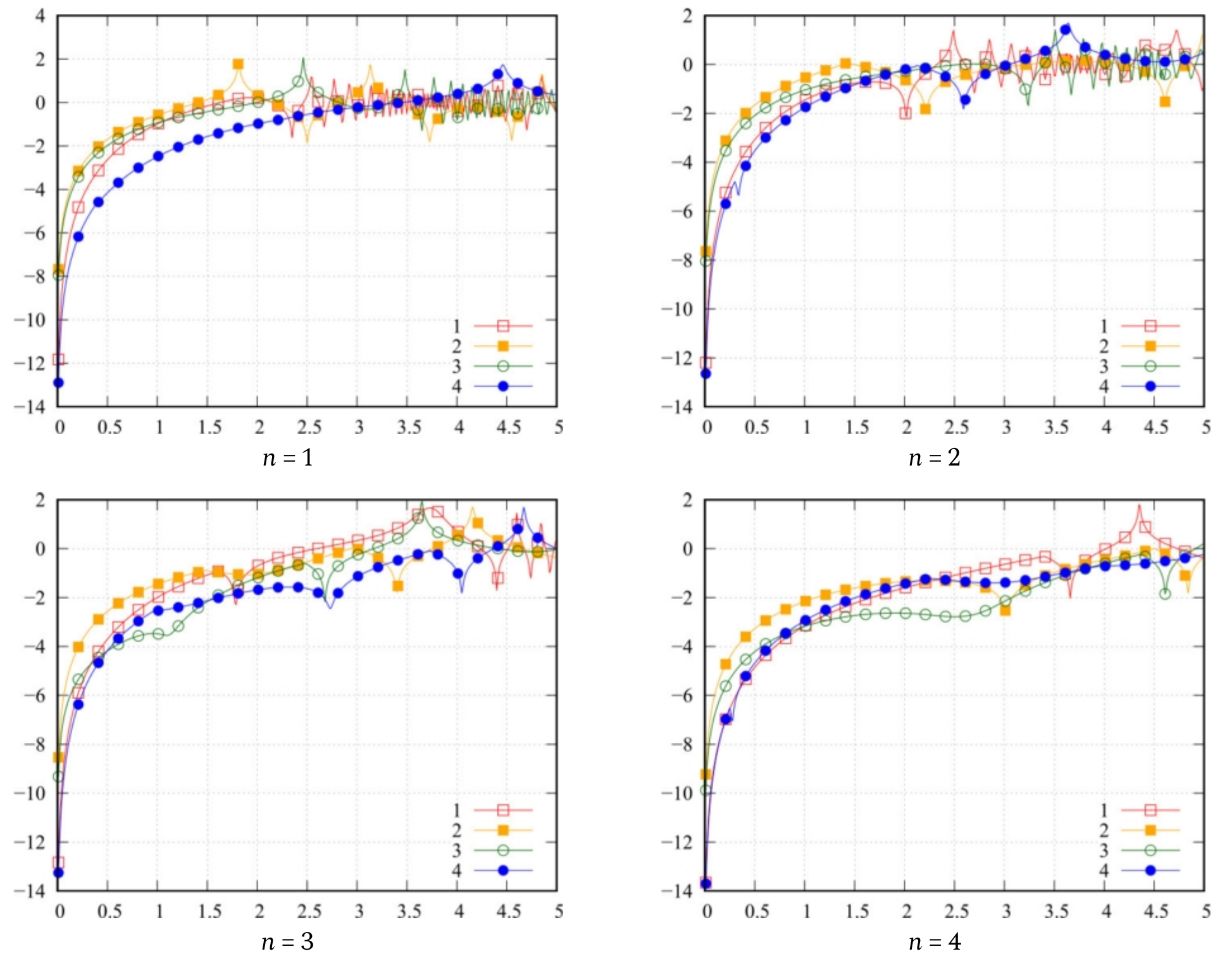 На рис. 4 приведены графики значений детализирующие невязку по для различных номеров СВ в угловых точках области . Вдоль оси абсцисс отложен номер СВ. Из представленных графиков видно, что наибольший вклад в ранее рассмотренные значения невязки вносят СВ с небольшими значениями номеров n, что является хорошим ориентиром при построении аппроксимаций СВ в области .
