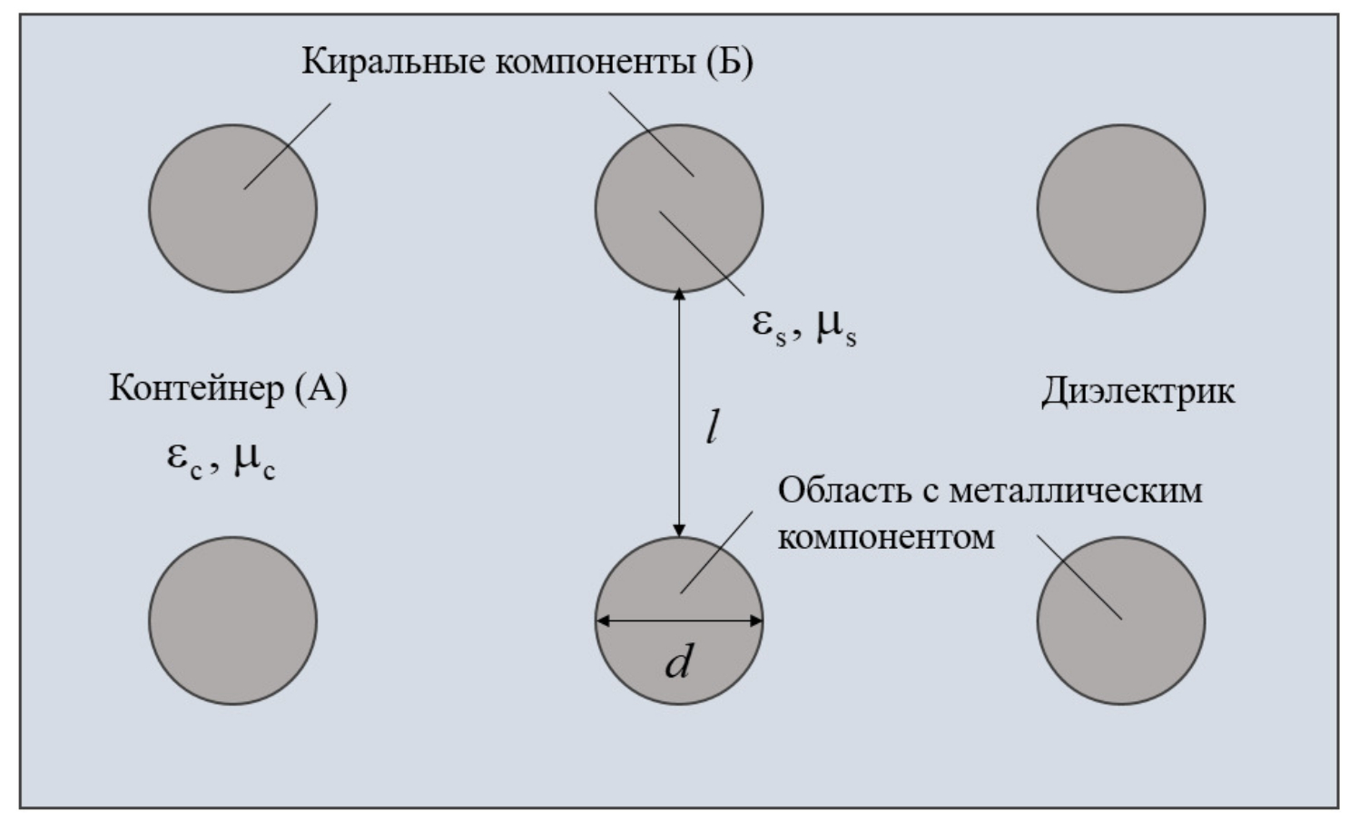 Let us consider the generalized structure of the arbitrary metamaterial shown in Fig. 1. The CMM consists of a dielectric container (A) with relative permeabilities and where chiral metal inclusions (B) are placed. The areas comprising mirror-like asymmetric elements have relative permeabilities and . The linear dimension of the areas is d, and the distance between adjacent elements is l.