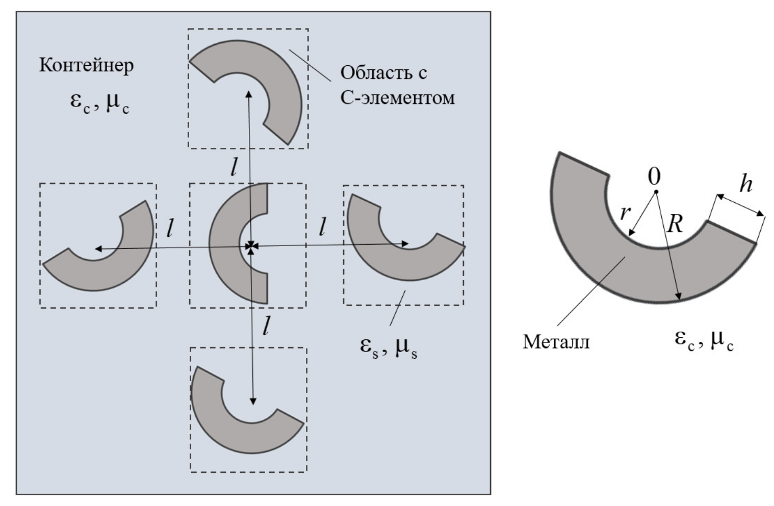 The structure of a CMM cell based on a C-shaped element is shown in Fig. 2. The C-shaped element is described by the outer radius R and inner radius r of the conductive strip. All elements are located at equal distances l from each other. In this case, the C-shaped elements can be rotated relative to their geometric centers in both vertical and horizontal planes.