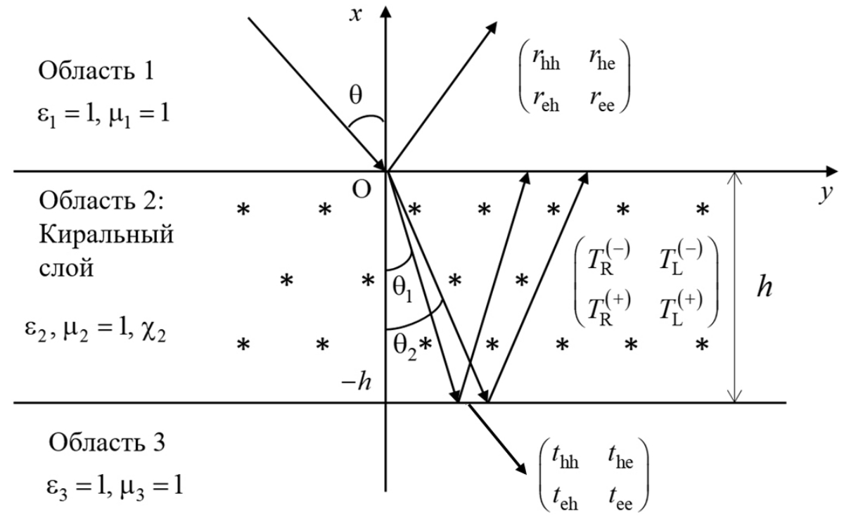 A plane electromagnetic wave is incident on a layer of metamaterial at an angle . Region 1 is a dielectric with dielectric and magnetic permeabilities and . The chiral layer (Region 2) is described by material parameters and within the proposed mathematical model of Eq. (7). The concentration of chiral inclusions in Region 2 is equal to . The thickness of the metamaterial layer is h. Region 3 is a dielectric with dielectric and magnetic permeabilities and . When solving the problem, we assume that the planar layer is indefinitely extended along the axis Oz and consider the phenomenon of cross-polarization that occurs when an electromagnetic wave is reflected (passed) from a layer of CMM, that is, when a wave with E-polarization is incident, components of the reflected and transmitted electromagnetic fields with H-polarization, and vice versa, will appear.