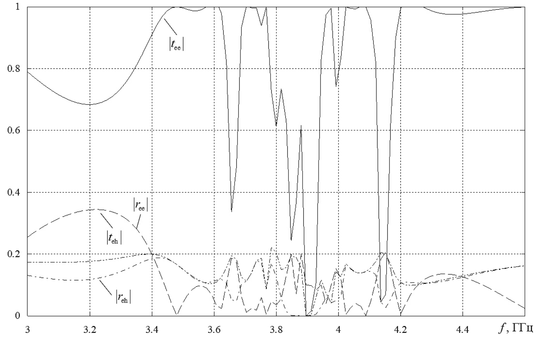 Fig. 4 shows the frequency dependence of the moduli of the reflection coefficients of the main ( denoted by the dotted line) and cross-polarized ( denoted by the dash-dash-dotted line) components and the transmission coefficients of the main ( denoted by the solid line) and cross-polarized ( denoted by the dash-dotted line) components of ametamaterial based on C-shaped elements with specified geometric dimensions.