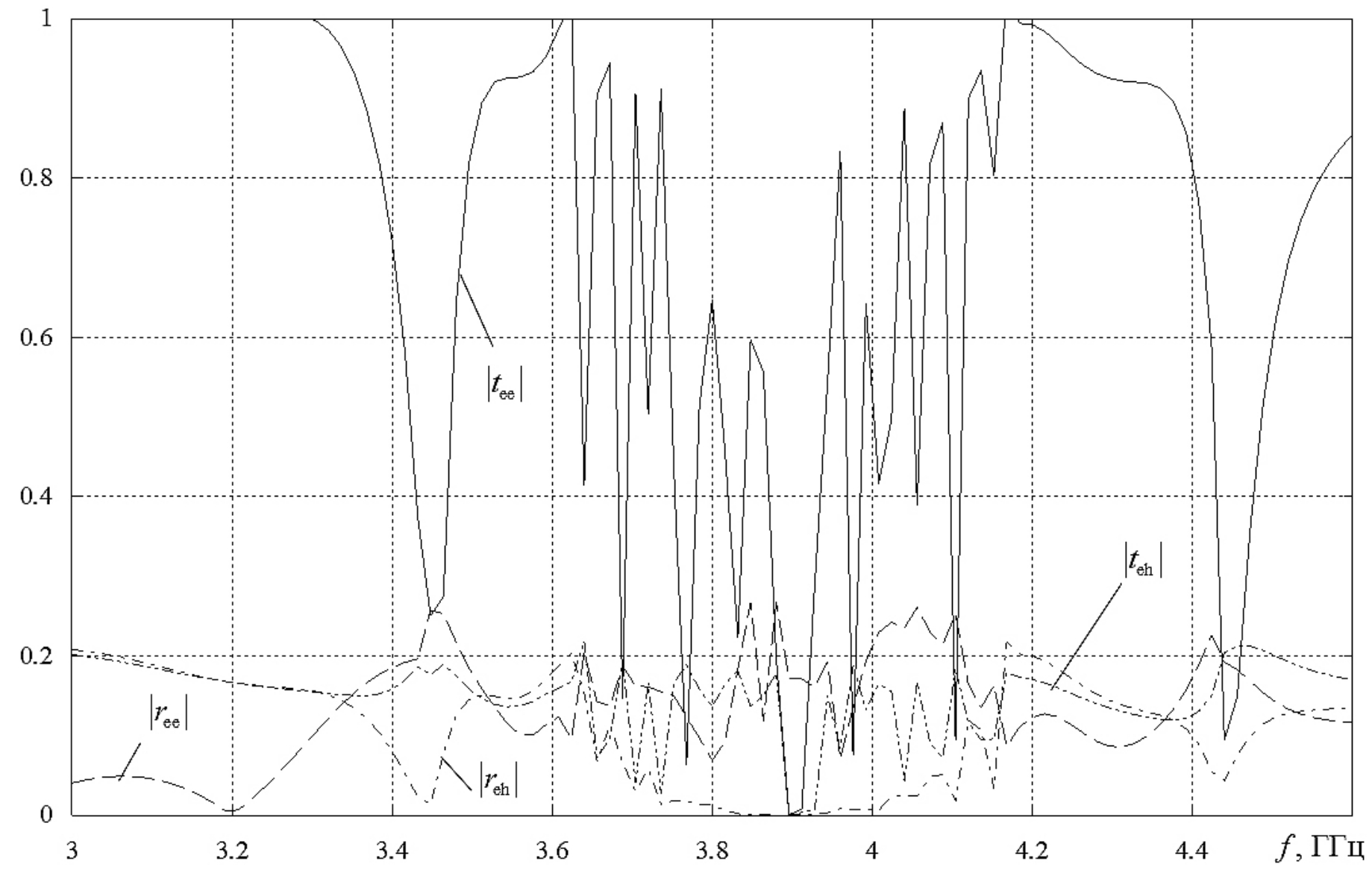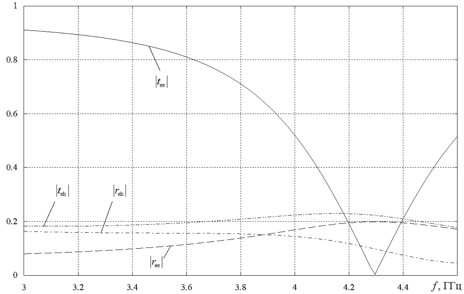 As shown in Fig. 4, in the frequency range under study, one resonant minimum is noted at a frequency of 4,3 GHz, at which the transmission coefficient of the main field component tends to zero. Near the same frequency, the moduli of the reflection coefficients of the main and cross-polarized field components and the modulus of the transmission coefficient of the cross-polarized component do not exceed 0,2, which corresponds to the mode of microwave energy concentration in the CMM layer. Notably, compared with the previous case, the resonant minimum near the frequency of 4,3 GHz is wide; therefore, the energy concentration occurs in the frequency range of 4,2–4,4 GHz.