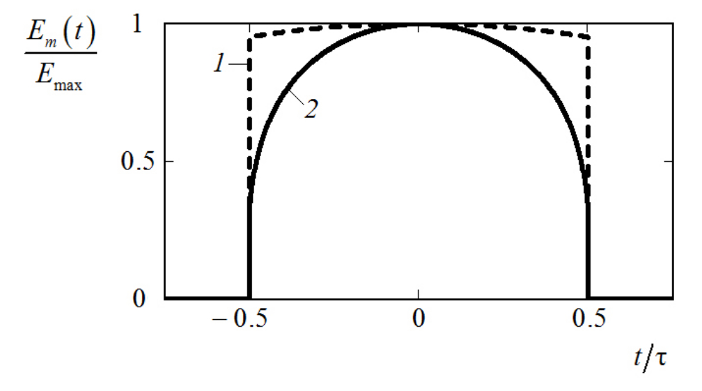 На рис. 1 показаны графики временных зависимостей нормированных оптимальных огибающих СВЧ-импульса при различных значениях отношения При пиковом поле, незначительно превышающем статический пробойный уровень (при длинных импульсах), оптимальная форма близка к прямоугольной. При увеличении надкритичности огибающая все сильнее отличается от прямоугольного импульса и приобретает овальную форму (при коротких импульсах).