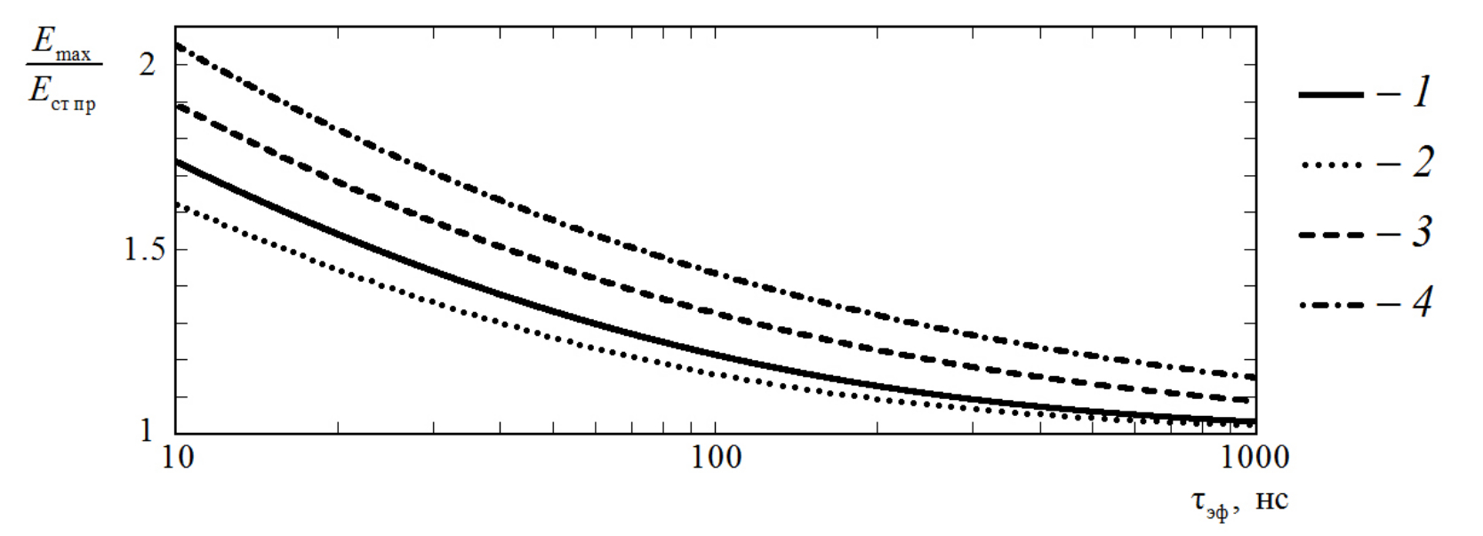 На рис. 2 показаны графики зависимостей нормированных пробойных полей от эффективной длительности СВЧ-импульсов с рассматриваемыми видами огибающих. Графики построены в программе Mathcad с использованием выражений (27), (33), (38), (44). Из графиков видно, что при одинаковых эффективных длительностях наибольшее пробойное поле имеет импульс с треугольной огибающей, а наименьшее – импульс с прямоугольной огибающей. На нижней границе рассматриваемого диапазона длительностей указанные поля отличаются в 1,27 раза, а на верхней границе – в 1,05 раза. При увеличении эффективной длительности различия между пробойными полями уменьшаются, а их значения стремятся к статическому пробойному уровню.