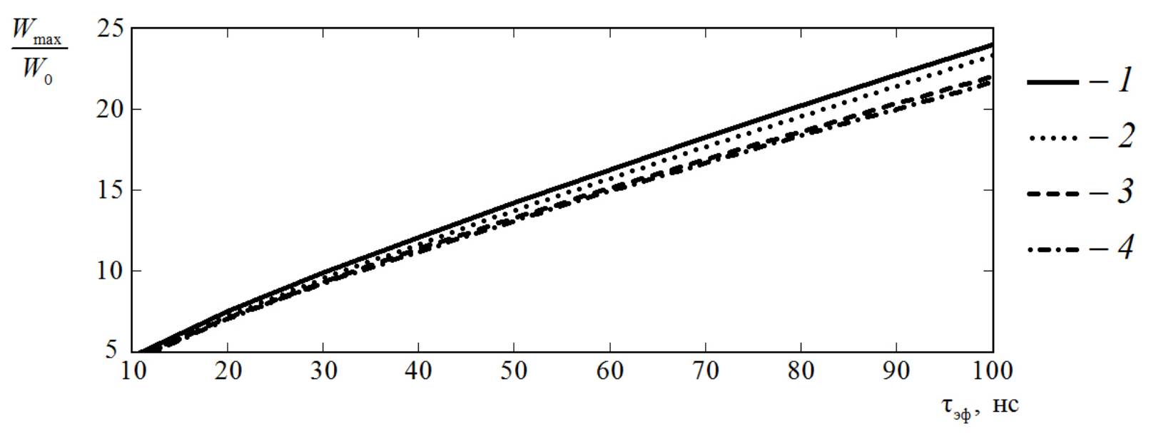 Рис. 3. Зависимости предельно допустимой энергии коротких СВЧ-импульсов от эффективной длительности огибающей: 1 – оптимальная огибающая; 2 – прямоугольная огибающая; 3 – гауссова огибающая; 4 – треугольная огибающая / Fig. 3. Dependences of the maximum allowable energy of short microwave pulses on the effective duration of the envelope: 1 – optimal envelope; 2 – rectangular envelope; 3 – Gaussian envelope; 4 – triangular envelope