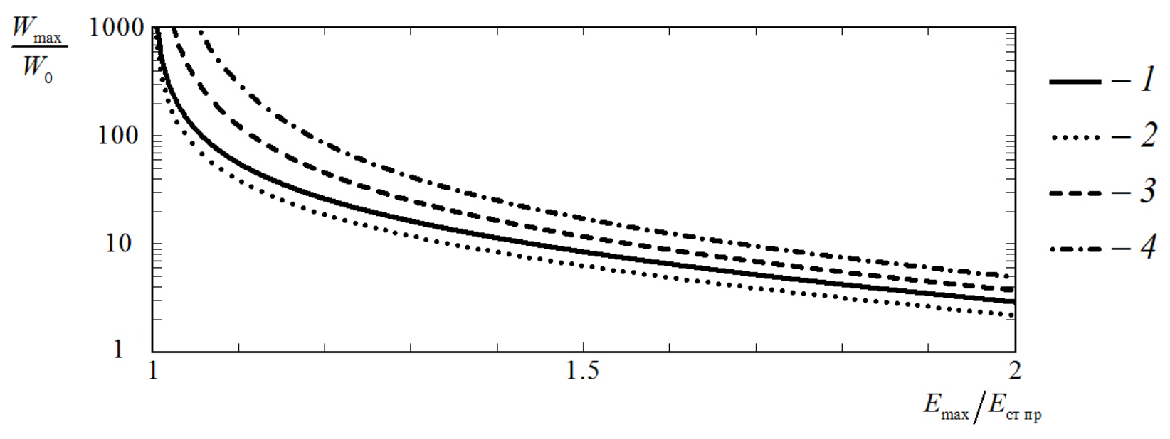 Рис. 5. Зависимости предельно допустимой энергии от пробойного поля СВЧ-импульса: 1 – оптимальная огибающая; 2 – прямоугольная огибающая; 3 – гауссова огибающая; 4 – треугольная огибающая / Fig. 5. Dependences of the maximum allowable energy on the breakdown field of the microwave pulse: 1 – optimal envelope; 2 – rectangular envelope; 3 – Gaussian envelope; 4 – triangular envelope