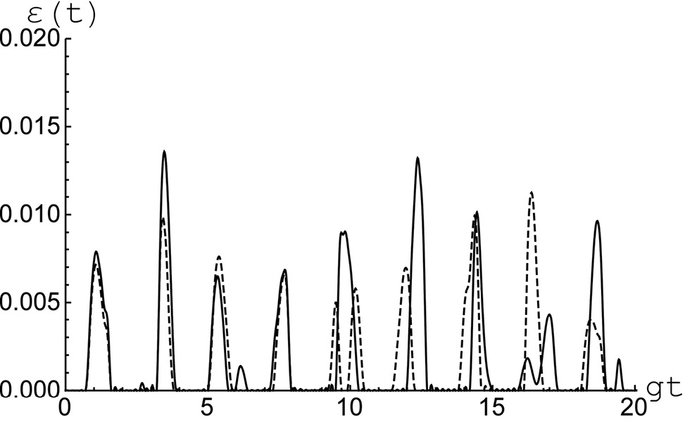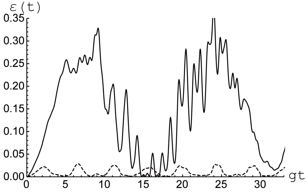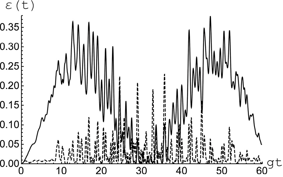 Рис. 5. Отрицательность как функция безразмерного времени для белловского перепутанного (5) с Параметр диполь-дипольного взаимодействия (штриховая линия) и (сплошная линия). Среднее число тепловых фотонов