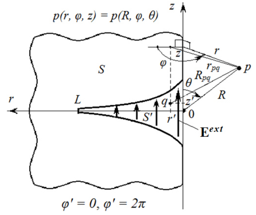 Рассмотрим постановку задачи и способ ее решения. Поместим бесконечную идеально отражающую полуплоскость в свободном, однородном и изотропном пространстве таким образом, чтобы край или ребро полуплоскости были совмещены с осью цилиндрической системы координат (рис.). Расширяющаяся ЩЛ своим широким концом подходит к краю полуплоскости, является симметричной относительно своей длины и может быть выполнена с различным законом расширения щели. Продольная длина щелевой антенн L, ее площадь а также цилиндрические и сферические координаты показаны на рис., где также изображены точка источников поля или магнитный заряд в апертуре расширяющейся щели и точка наблюдения поля которая располагается в дальней зоне.