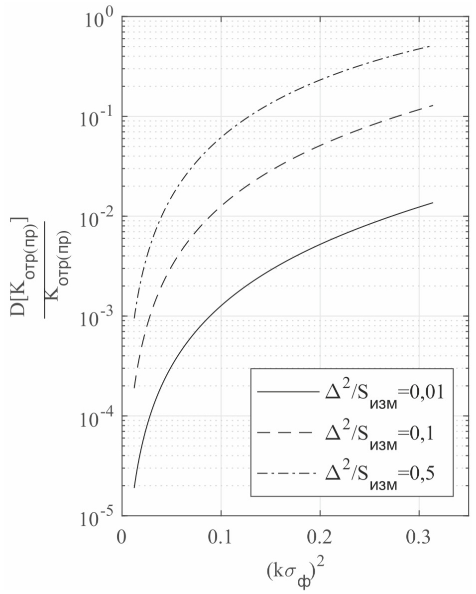 Графики зависимости относительных ошибок измерения коэффициентов пропускания и отражения приведены на рисунке. Из приведенных графиков следует, что для обеспечения измерений КП и КО с точностью 15÷20 % и при малом интервале пространственной корреляции случайных флюктуаций измеренных полей фазовая погрешность формирования полей не должна превышать рад.