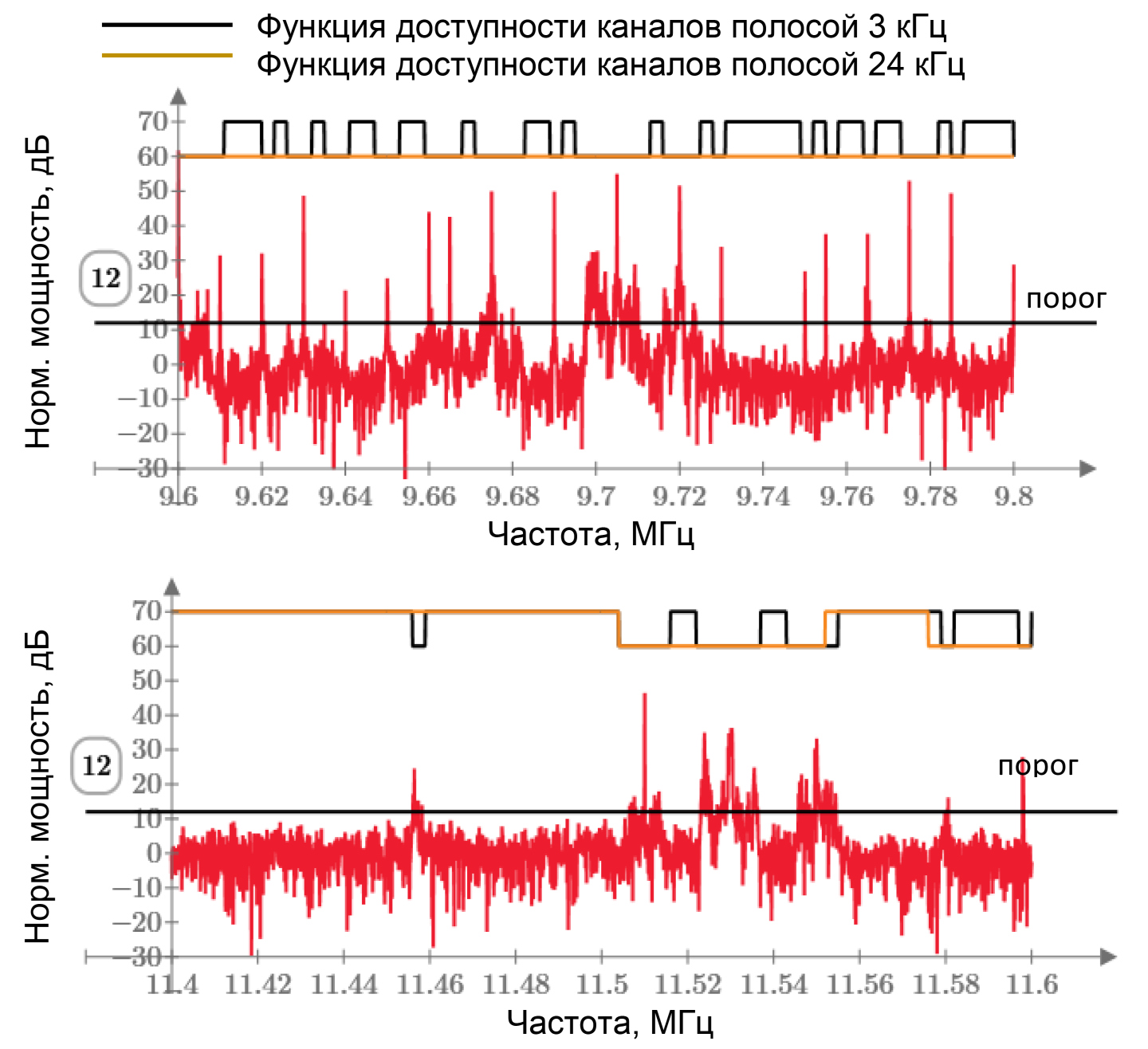 Методика оценки доступности каналов основана на сравнении спектральных отсчетов, попада ющих в полосу канала с порогом. Для оценки примыкающих каналов с полосой 3 кГц в каждом канале будет по 30 спектральных отсчетов, полученных с шагом 100 Гц. Канал с полосой 3 кГц считается доступным, если все отсчеты ниже уровня порога. В результате для каналов 3 кГц вычисляется дискретная бинарная функция. Высокий уровень «1» показывает, что канал доступен, низкий «0» – канал занят. Данная функция может быть использована для бланкирования помех. СРС-сигналы более помехоустойчивы. Широкополосный канал с полосой 24 кГц можно разделить на 8 образующих его примыкающих узкополосных подканалов по 3 кГц. В работе [9], исходя из оценки энергетических потерь показано, что для ФКМ-сигнала с полосой 24 кГц, используемого для вертикального зондирования, канал считается доступным если 7 из 8 образующих его подканалов доступны. Пример работы алгоритма показан на рис. 6.