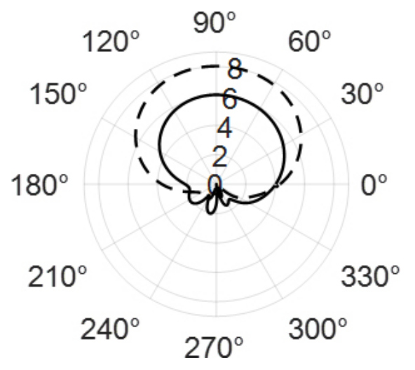 Рис. 2. Диаграммы направленности в горизонтальной плоскости изолированного антенного элемента (пунктирная линия) и элемента в составе решетки (сплошная линия