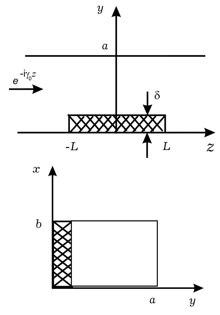 Таким образом, задача дифракции волны прямоугольного волновода на отрезке полупроводниковой пленки малой толщины δ мы свели к задаче дифракции волны H10 на отрезке прямоугольного волновода, для одной из узких стенок которого справедливо импедансное граничное условие (8). Поэтому, развиваемый ниже метод расчета тонкослоистых полупроводниковых неоднородностей справедлив для всех тех неоднородностей в прямоугольном волноводе, для которых можно записать соответствующие эквивалентные граничные условия типа (8).