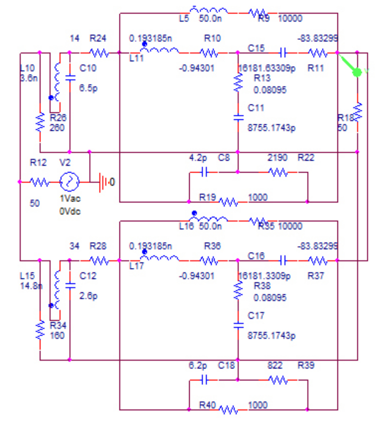 Fig. 10. Equivalent circuit of an amplifier consisting of two unequal stages (Fig. 8), corresponding to the structural diagram (Fig. 1, a), studied in the MathCad (Fig. 9, b) and OrCad (Fig. 9, c) systems