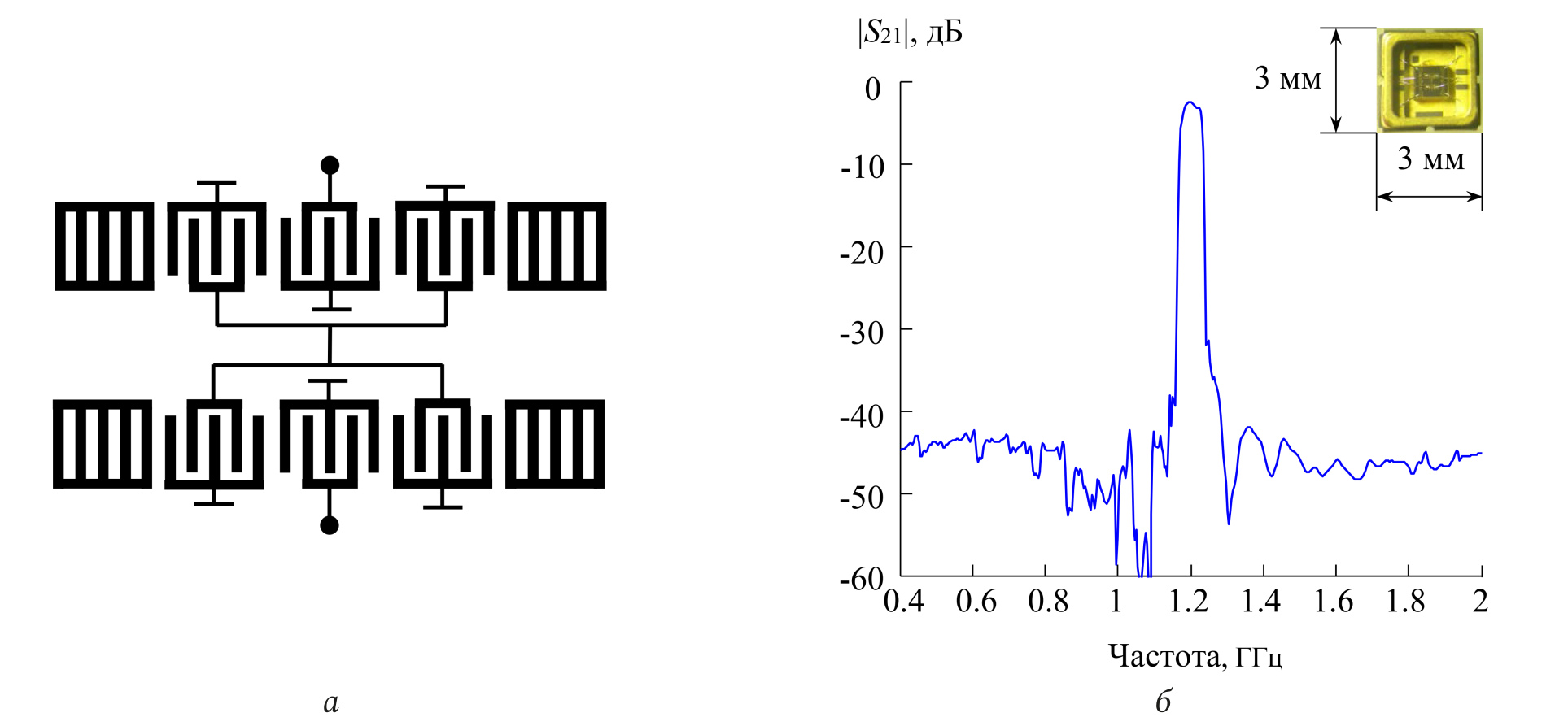 Рис. 7. Трехзвенный полосовой Чебышевский фильтр: а – многослойная керамическая структура; б – экспериментальная АЧХ