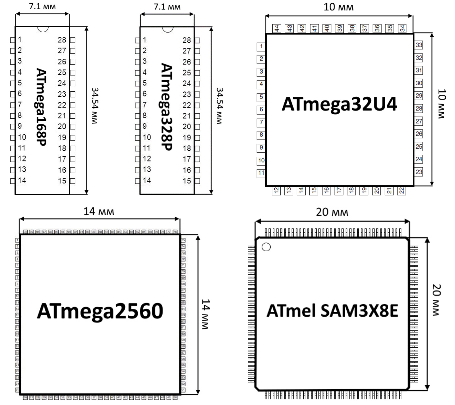 ATmega168P | ATmega328P | ATmega32u4 | ATmega2560 | Atmel SAM3X8E | |