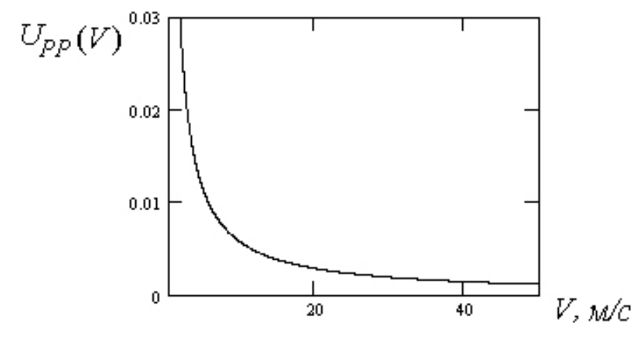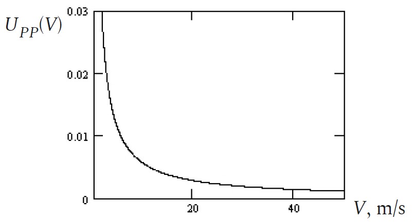 As can be seen from the graph, with increasing atmospheric wind velocity in the antenna plane, the value of the spectral function and, consequently, the influence of turbulence on the radio signal decreases. This is because the wind blows away the turbulent ripples in the antenna plane, reducing their effect on the received radio signal.