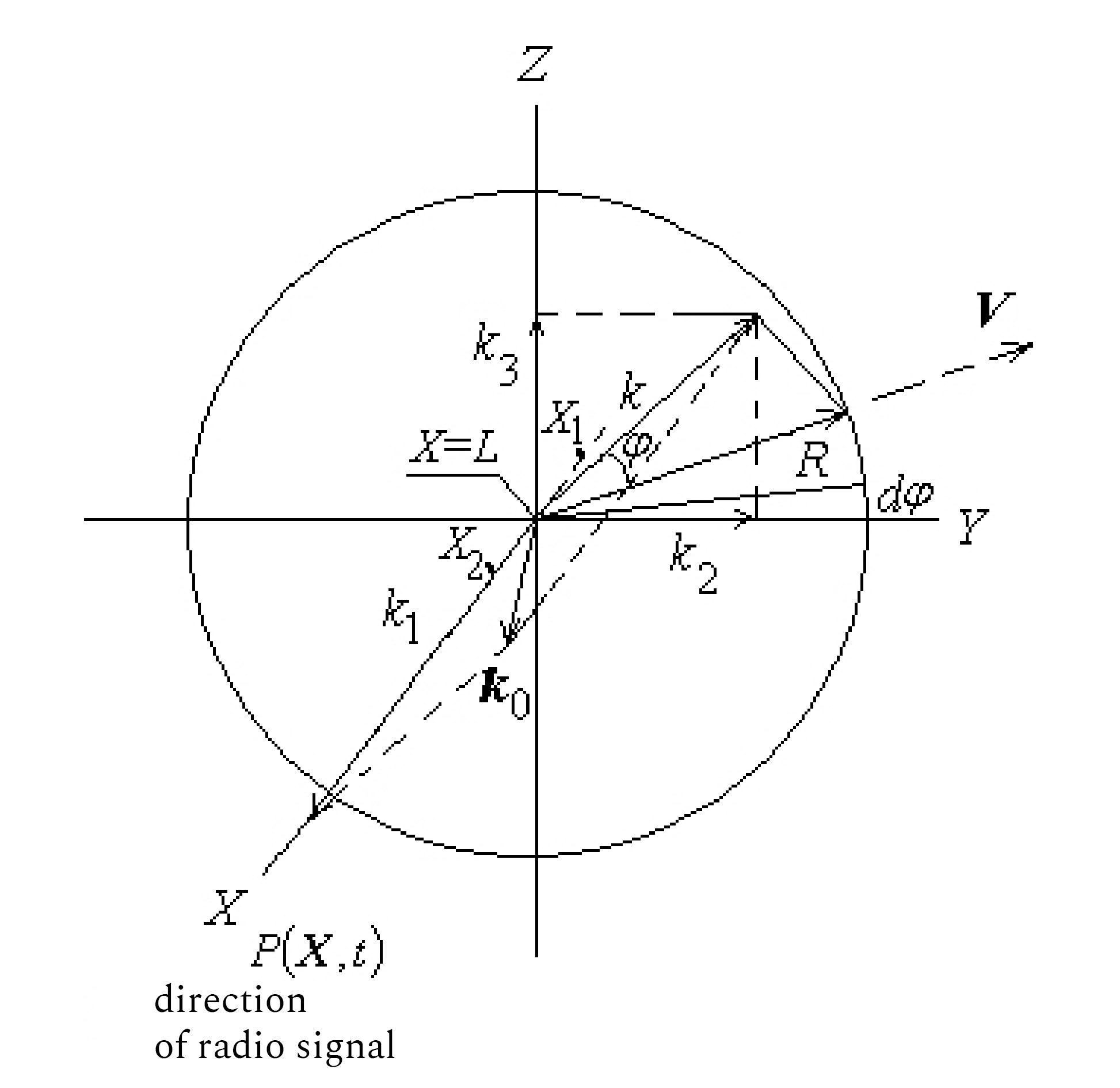 We assume that the ripples of the wavenumber of the radio signal are proportional to the turbulent ripples of For simplicity of calculations, we shall assume that In this case, the spectral function of the pulsations of the wavenumber of the electromagnetic wave In addition, as in [2], we assume that where the constant value of does not depend on the wave number of turbulence This law mainly reflects the turbulent inertial region [3]. Turbulence in this region is in statistical equilibrium: the energy flux from larger turbulent vortices to smaller ones is determined by viscous dissipation of the smallest vortices.