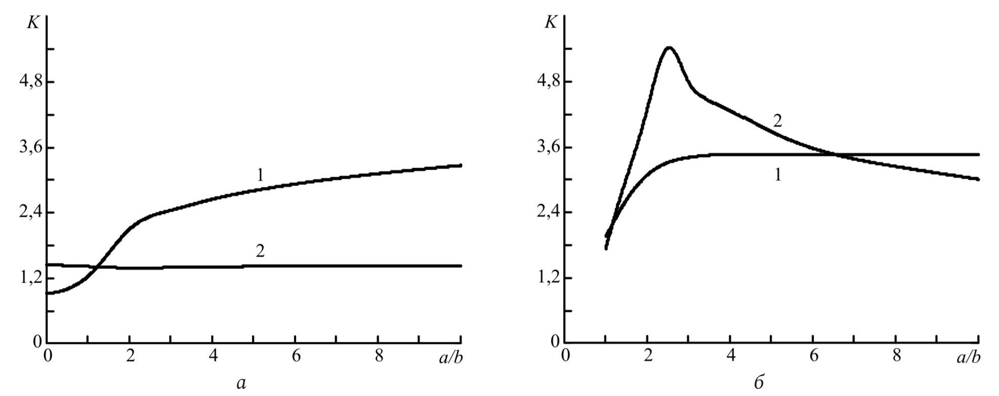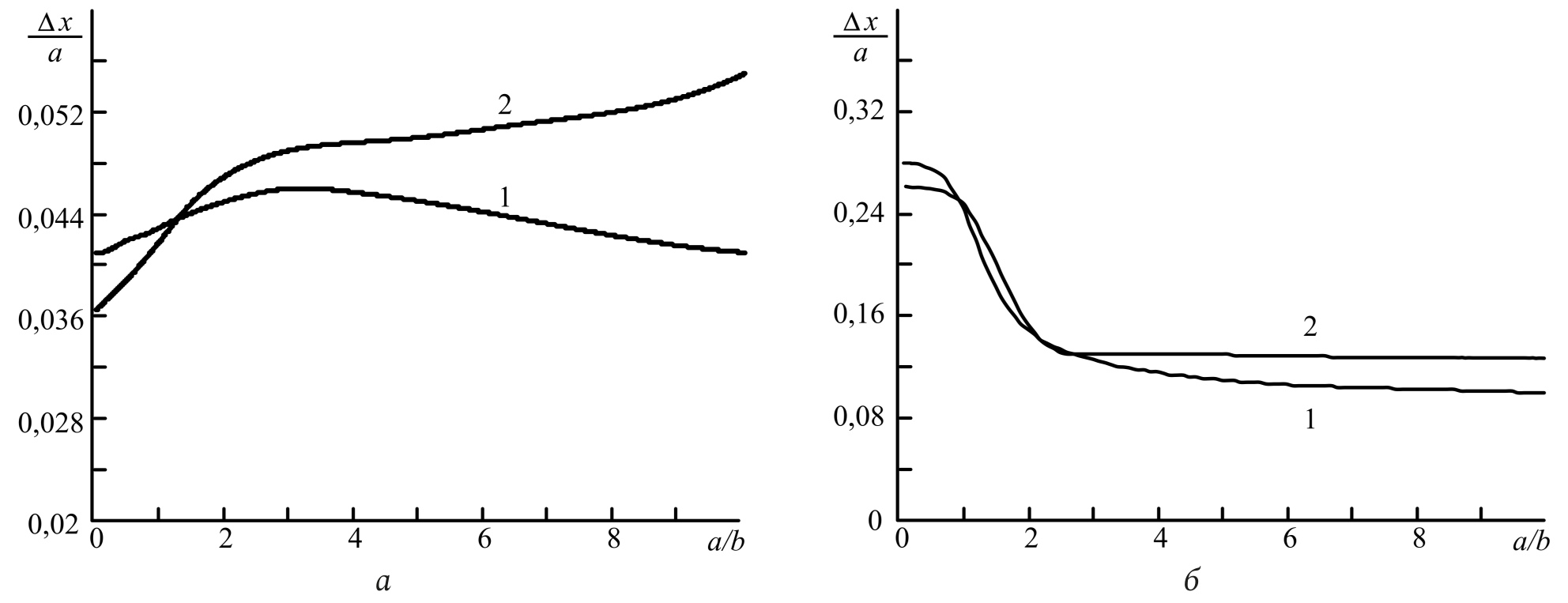 Рис. 2. Зависимость полуширины центрального максимума модуля ФРТ от ширины гауссовой волны накачки: вторая волна накачки гауссова, первая волна накачки одномодовая (1); первая волна накачки гауссова, вторая волна накачки одномодовая (2) при (а), 0,5 (б)