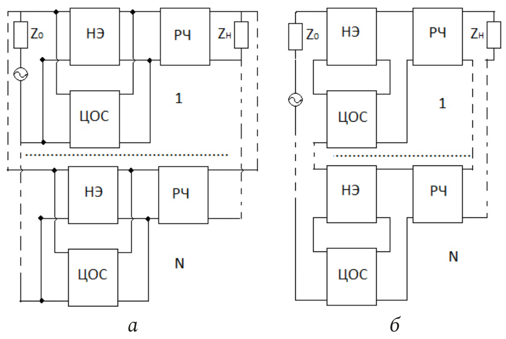 В данной работе предлагается рассмотреть особенности этих алгоритмов с учетом наличия каскадов типа «нелинейная часть (НЧ) – резистивный четырехполюсник (РЧ)». Эти каскады включены между источником сигнала с сопротивлением и нагрузкой (рис. 1, 2). При этом учитывалось, что НЧ состоит из трехполюсного нелинейного элемента (НЭ) и охватыва ющей его цепи обратной связи (ЦОС – параллельной или последовательной по току или напряжению).