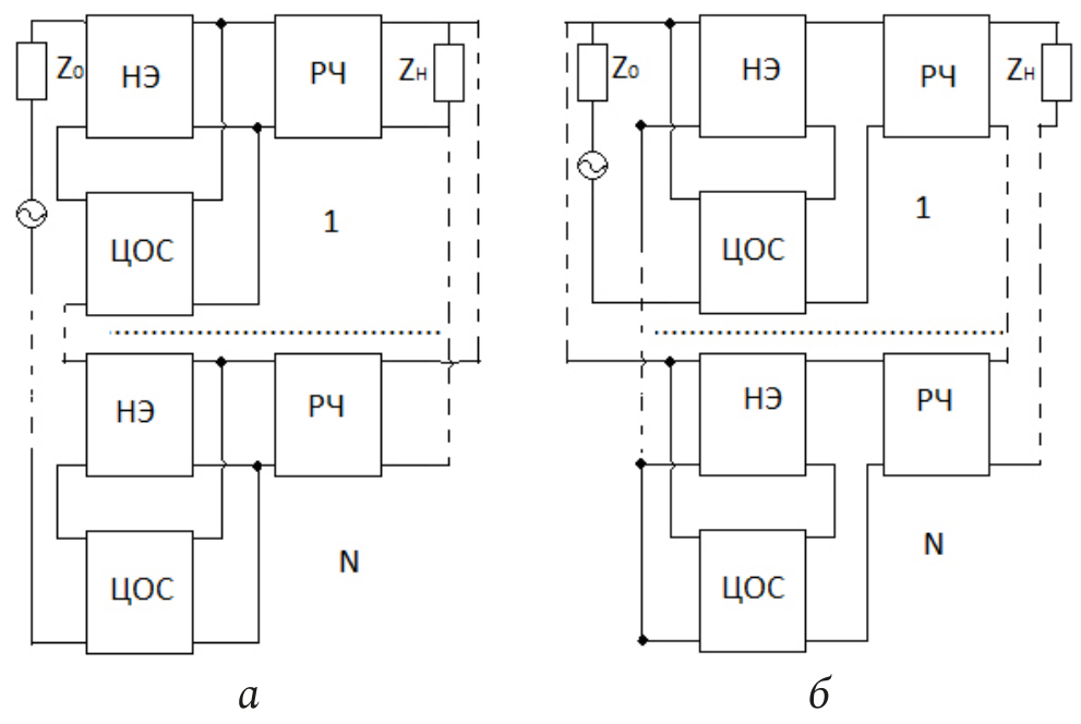 Рис. 1. Структурные схемы многокаскадных радиоустройств с параллельной по напряжению (а) и последовательной по току (б) цепями обратной связи, включенными между источником сигнала и РЧ