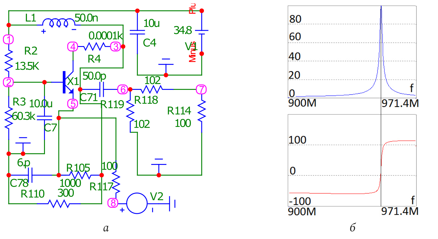 Fig. 5. Schematic diagram of a single-stage amplifier (a), corresponding to the block diagram (Fig. 1, a), at voltage U = 34,8 V, frequency response and phase response (b), studied in the MicroCap system
