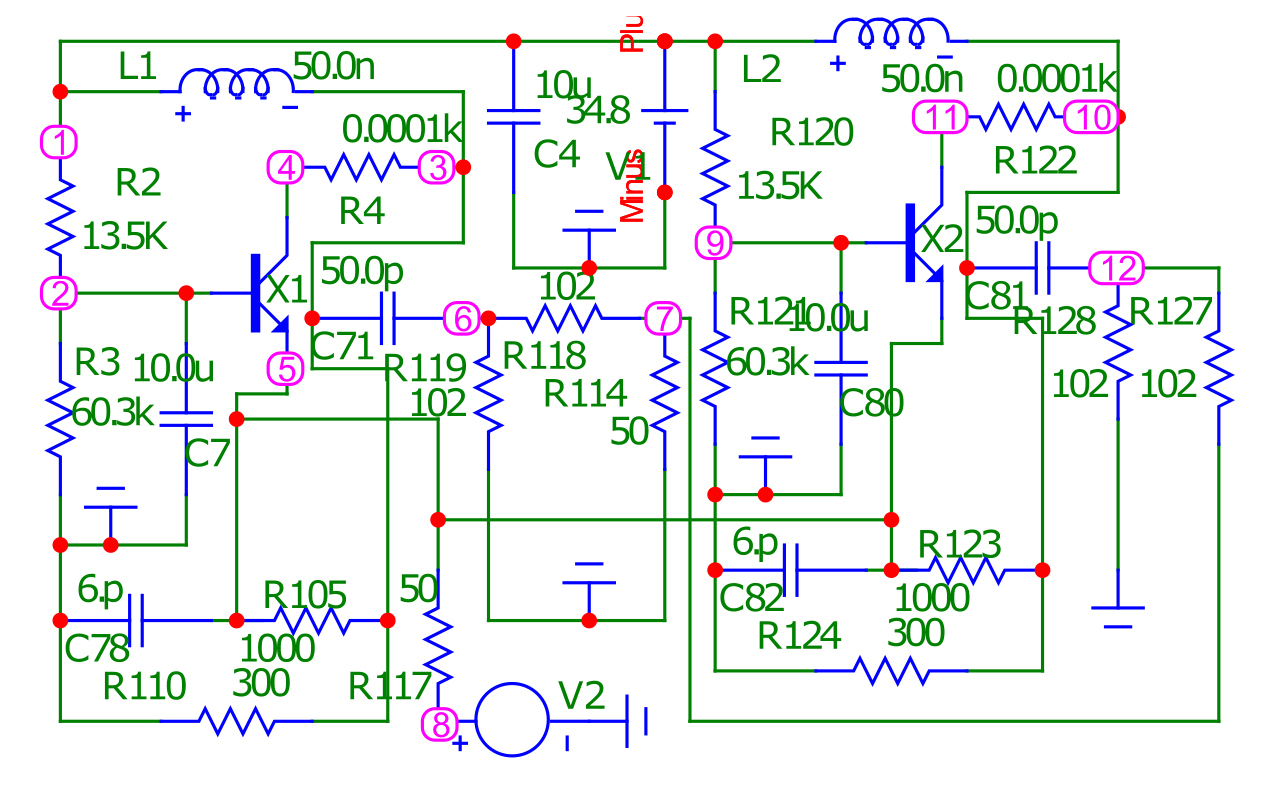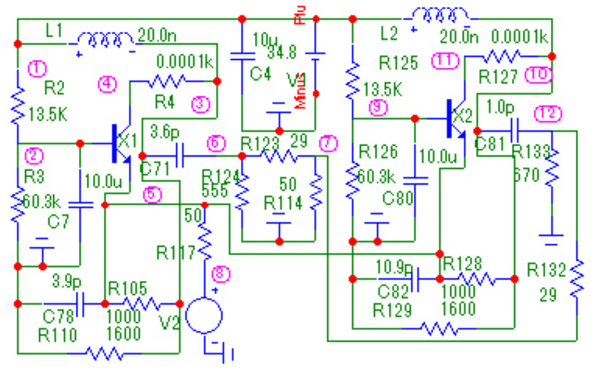 Схема НЧ реализована в виде параллельно соединенных эквивалентной схемы нелинейного элемента и цепи обратной связи из П-образного соединения трех элементов – Параметры ЦОС заданы произвольно. Схема РЧ собрана на основе Г-образного соединения двух элементов –