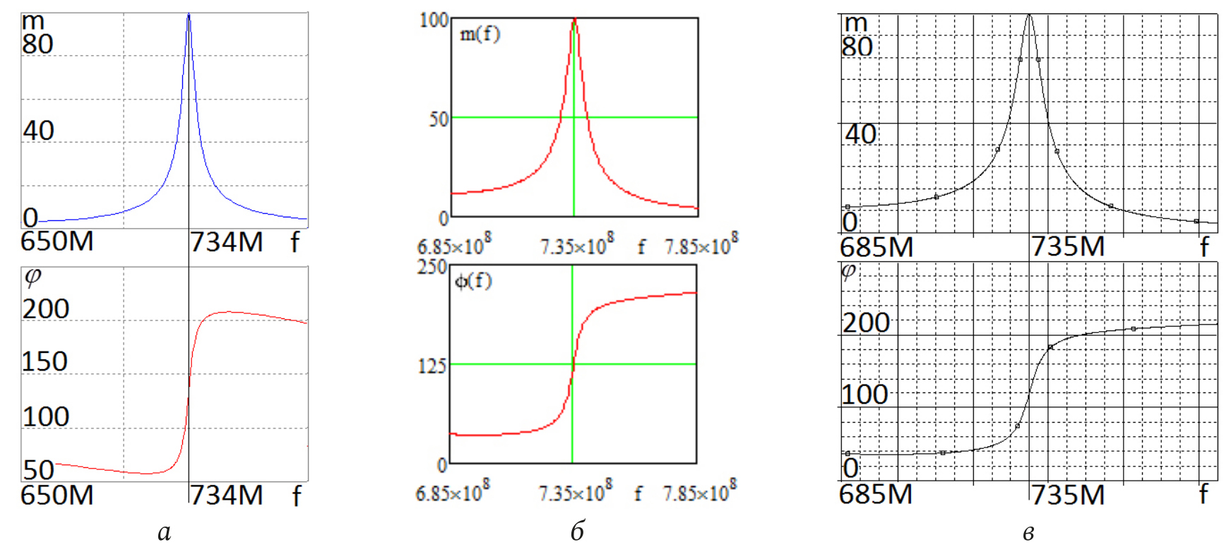 Средняя частота эквивалентной схемы (рис. 10) МГц (рис. 11, б и в) незначительно отличается от средней частоты принципиальной схемы МГц (рис. 11, а). Значения модулей передаточной функции принципиальной (рис. 10) и эквивалентной (рис. 11) схем усилителя Формы АЧХ и ФЧХ совпадают удовлетворительно. Сопротивления РЧ, ЦОС, нагрузки и источника сигнала принципиальных и эквивалентных схем усилителей полностью совпадают.