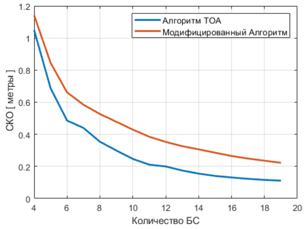 Из рис. 3 видно, что СКО измерения координат алгоритмом TOA ниже модифицированного варианта в 1,41 раза.