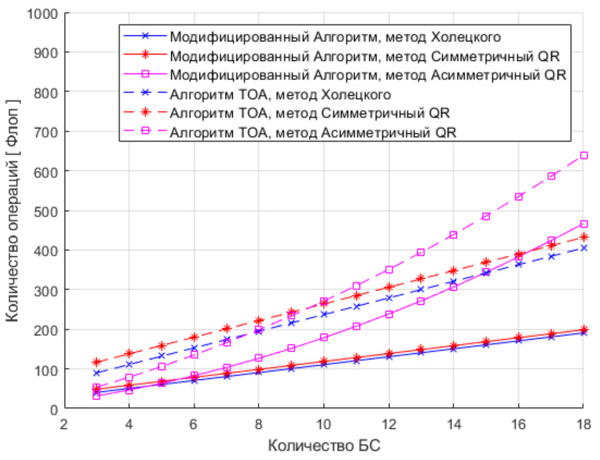 Вычислительная сложность алгоритмов оценки координат БПЛА в зависимости от числа БС показана на рис. 4.