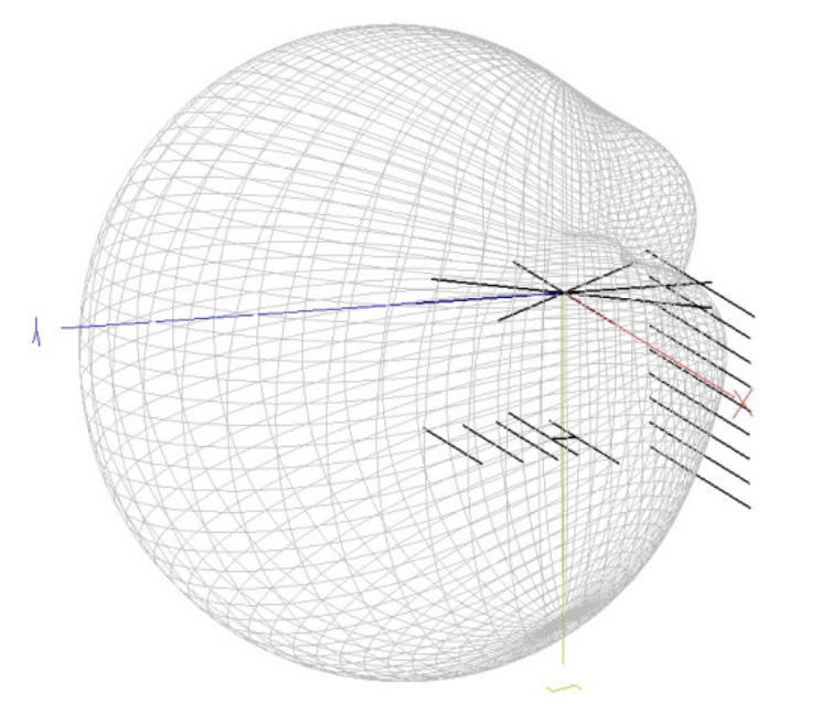 Антенна РСА – широкополосная 4-элементная антенна Yagi–Uda, оптимизированная для установки на октокоптере. Антенная система предназначена для излучения и приема сигнала в диапазоне от 125 до 182 МГц. Значение КСВ в рабочем диапазоне не превышает 1,75. Максимальное усиление – 7,3 дБ. На рис. 3 показана рассчитанная в пакете MMANA-GAL диаграмма направленности антенного устройства, учитывающая влияние элементов конструкции октокоптера.