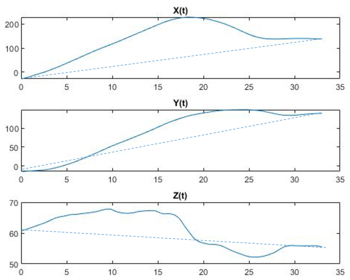 Рис. 6. Траектория БПЛА, полученная в ходе эксперимента, – сплошная линия, прямолинейная – штрихованная линия